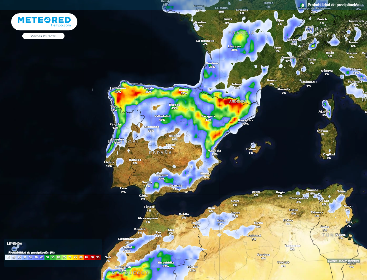 Mañana viernes, la inestabilidad atmosférica se irá desplazando hacia el norte de la Península. AEMET mantiene activados avisos amarillos en la mayor parte de zonas de interior del tercio norte peninsular, desde Galicia hasta el noroeste de Cataluña, incluyendo la totalidad de la Ribera del Ebro y la comunidad de Aragón en su totalidad, donde descargarán tormentas fuertes. Se mantienen los avisos naranjas en la costa de Castellón, extendiéndose también a la de Tarragona, tanto por la intensidad de los chubascos como por su persistencia. La actividad tormentosa será particularmente destacada por la tarde en áreas de montaña preferentemente de la mitad norte peninsular.